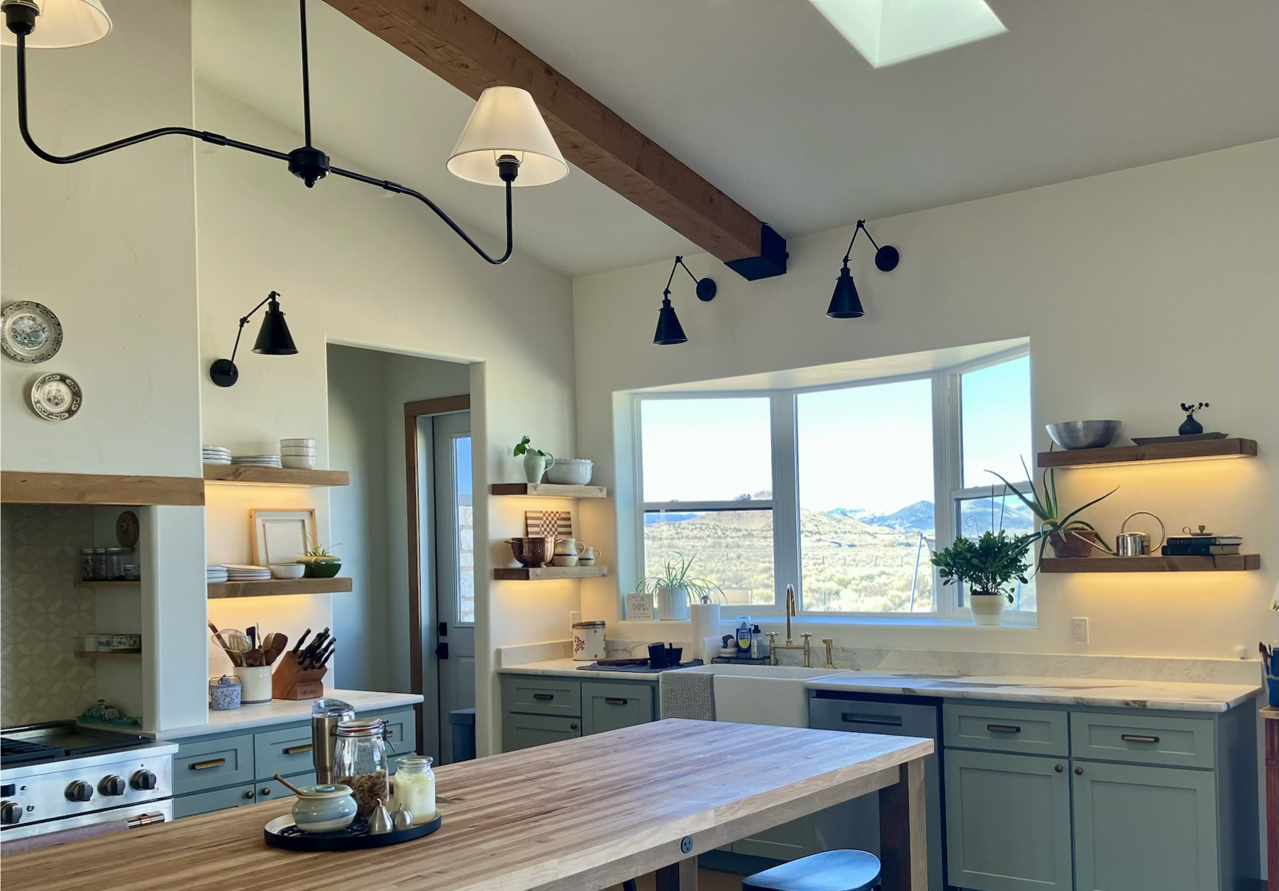 The kitchen is a cook’s and homesteader’s dream! Enjoy looking out at your acreage or watching the little ones play from your oversized farm sink with BrassPure Unlacquered Brass Kitchen Faucet. 11-foot hickory butcher block island with electricity, custom built by Columbine Woodworks in Monte Vista. Calacatta Martarazzo Marble countertops complement the open shelving. Full-sized walk-in pantry to store groceries, canning, and preserves, with the option to install an ice maker. Ample cabinetry space and more custom finishes in the landing pad/mud room, and an added bonus of a beverage cooler along with a GE stainless steel refrigerator/freezer. GE matching appliances, and Café freestanding propane double oven stove.